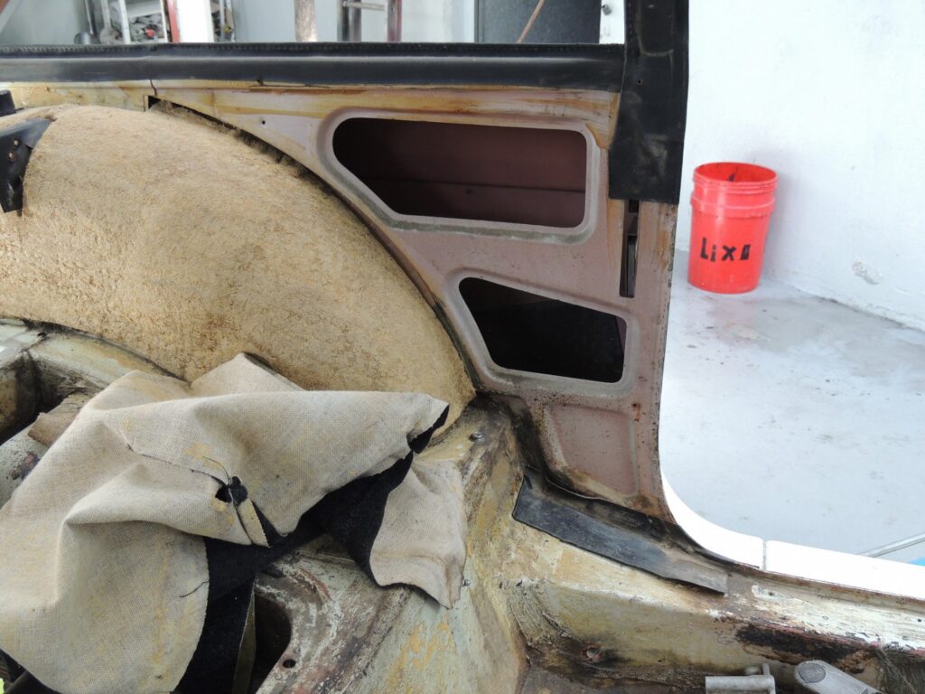 Continuando a desmontagem o cenário de ausência de corrosão mantem-se. Onde não há tinta porque não chegou lá no fabrico, ou está lascada, há primário ou cola dos forros.