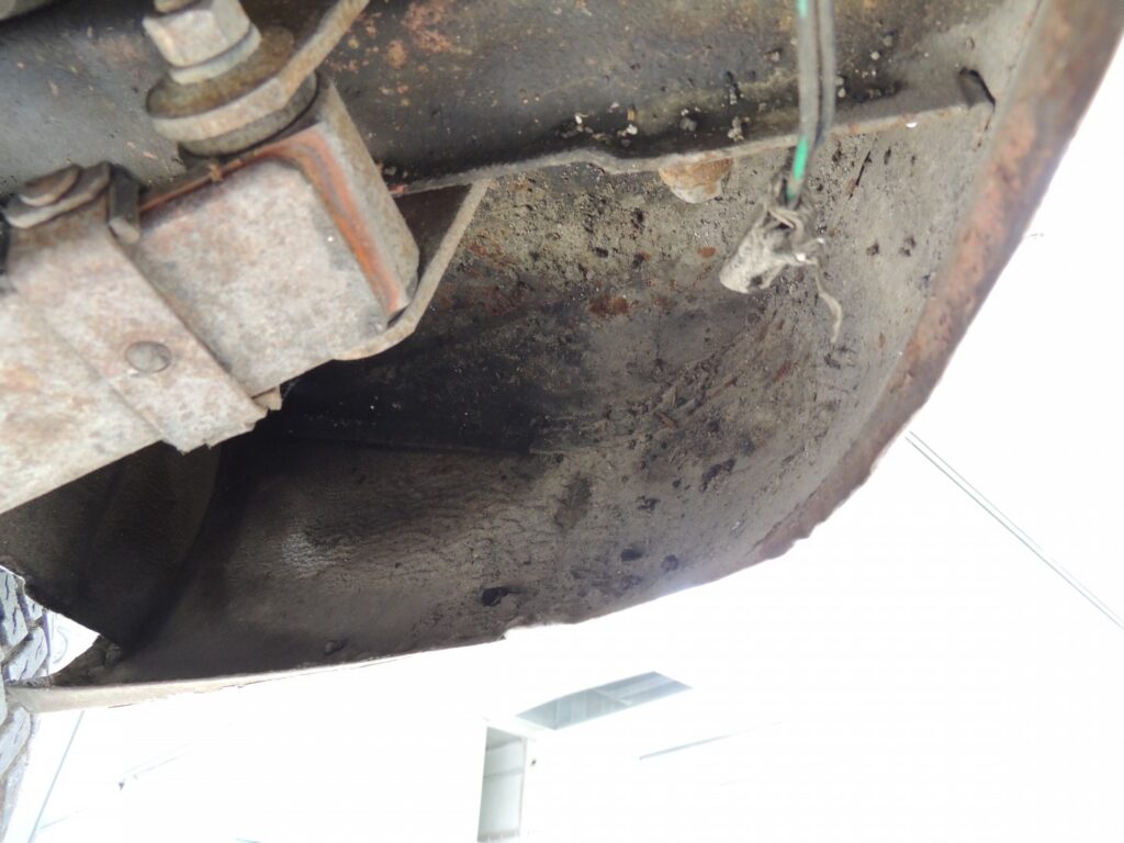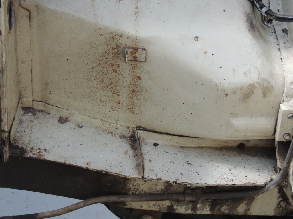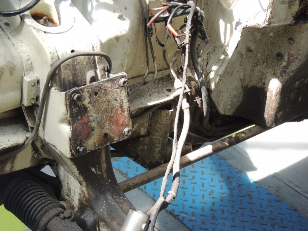 As primeiras surpresas desagradáveis, e ´não duvidem que as há sempre, aparecem no conjunto da suspensão da frente do lado esquerdo, claramente resultado de acidente antigo mal arranjado. Há componentes que não estão correctos e outros que em vez de substituídos foram soldados. A barra de torção também tinha sofrido com o acidente e estava mal desempenada. A Longarina também tem evidência de acidente e terá que ser vista com atenção quando tudo tiver sido removido.