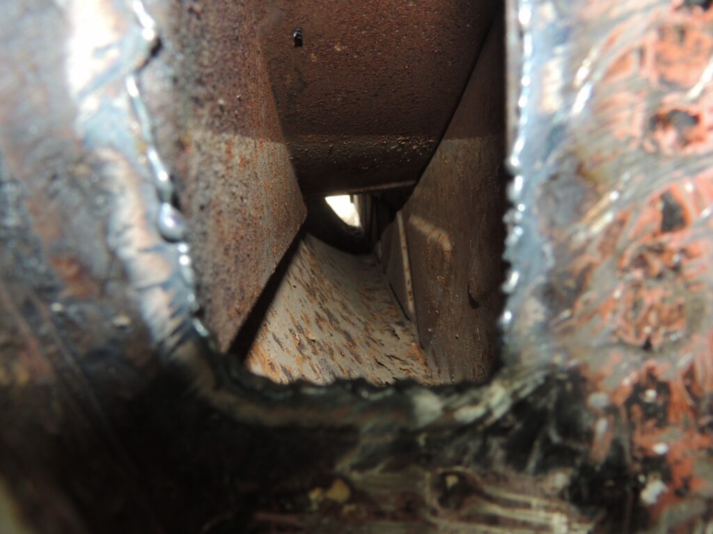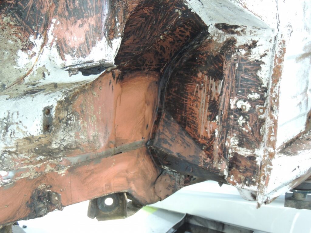 Em face deste cenário optimista, optamos por abrir pequenas janelas nas cavas das rodas para espreitar para dentro das embaladeiras. Apesar de terem passado 46 anos o que encontrámos foi sujidade na forma de lamas secas e ferrugem superficial que podia ser facilmente limpa com o jacto de arreia e sopro de ar comprimido, para seguidamente isolar a chapa com materiais modernos. Se entrou água durante o tempo que foi usado na estrada, também saiu e não fez estragos. Nunca vi nenhum assim e duvido que quem tem experiência de restauro deste tipo de carros, tenha alguma vez visto. Assim mais uma vez este MG vai conservar a sua chapa original não sendo necessário substituir nada.