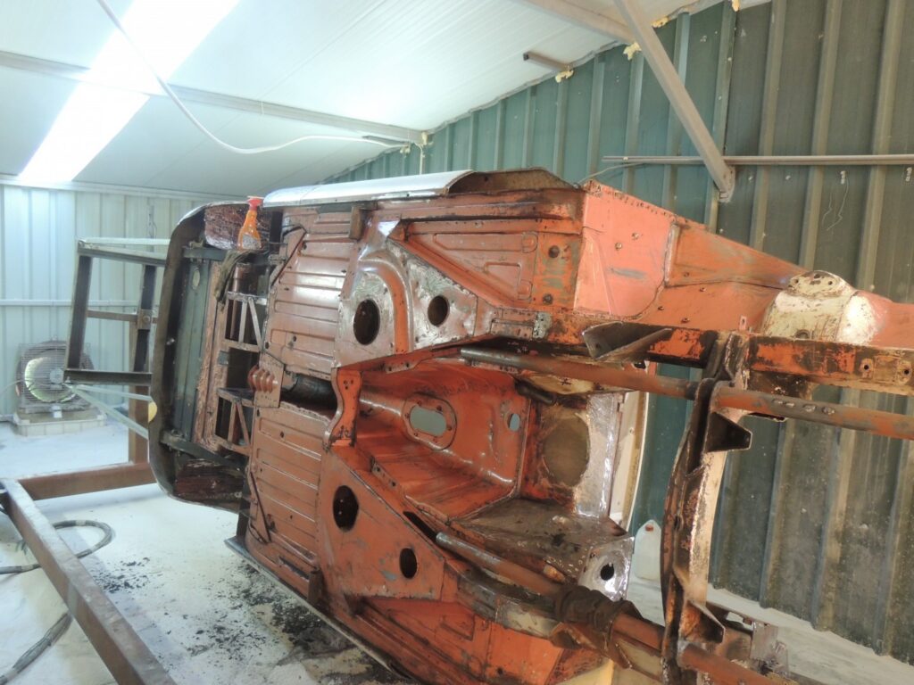 Pudemos constatar neste processo, que originalmente, a carroceria depois de montada era toda pintada com um primário cor de tijolo, que chegava mal às zonas mais escondidas como se pode ver nalgumas fotos. Por cima deste material e em toda a parte de baixo do carro e cavas das rodas, era aplicado um isolante macio de cor preta, que o jacto de areia não conseguia remover por ser mole e que teve que ser retirado com um solvente (diluente) até expor novamente o primário.